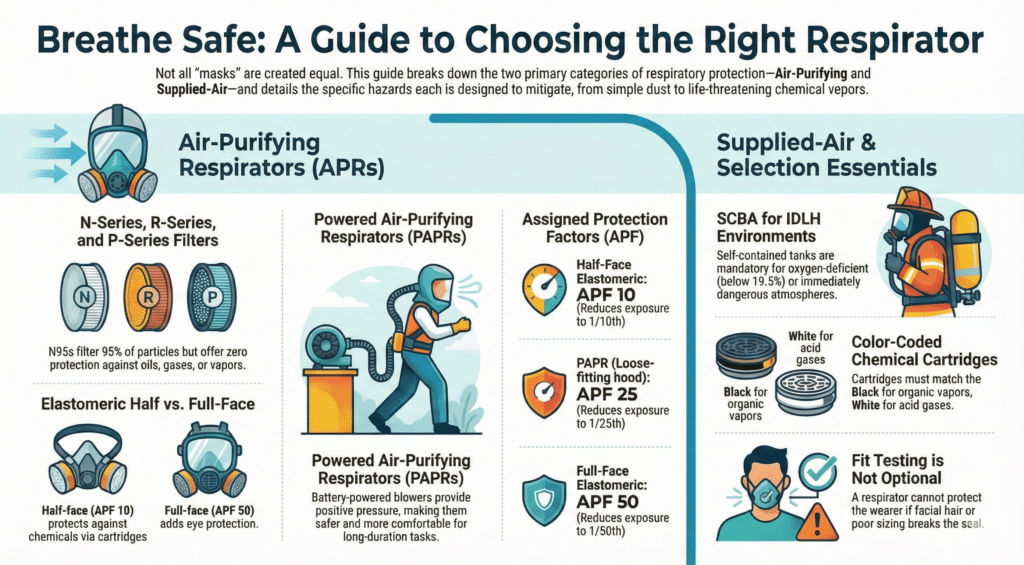 If you’ve ever walked a job site, toured a chemical plant, or managed a crew doing demolition work, you’ve probably seen workers wearing some kind of respiratory protection. But there’s a big difference between grabbing whatever mask is sitting in the supply cabinet and actually choosing the right respirator for the job. That distinction matters — not just for OSHA compliance, but for keeping people breathing safely for the rest of their lives.